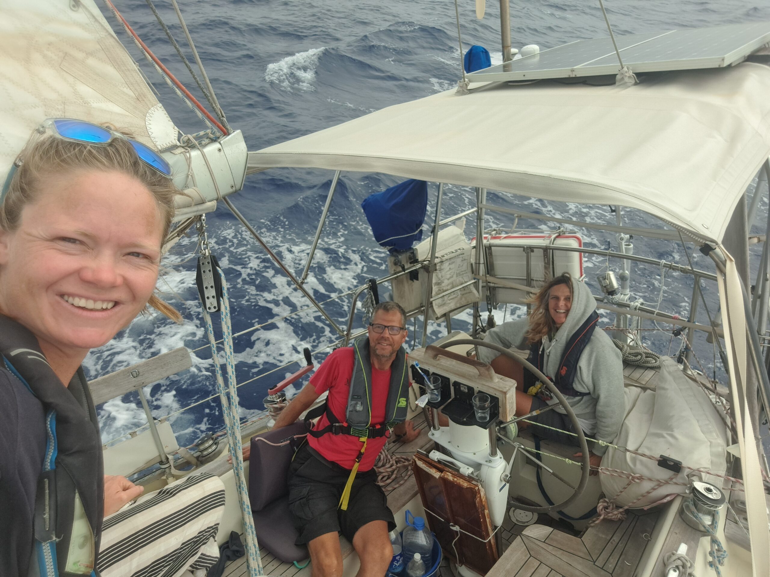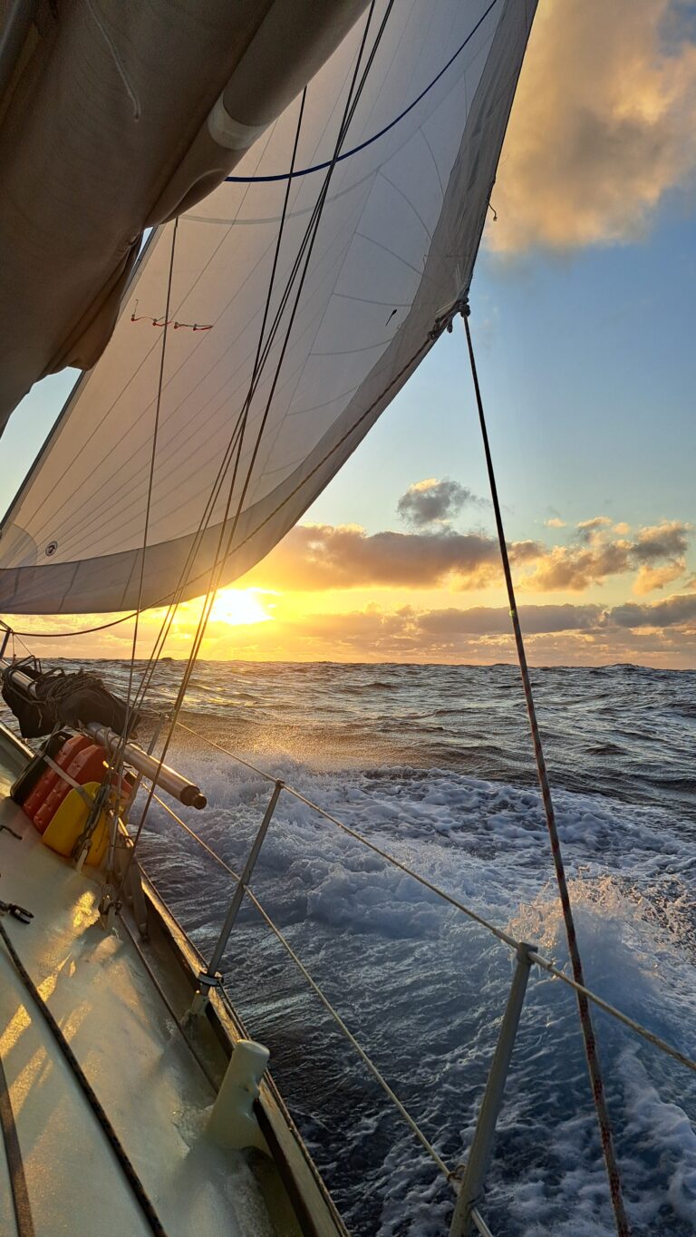 Als de wind na niemand-weet-hoeveel logboekpagina’s ploeteren eindelijk afneemt tot 15 knopen, is het tijd om de yankee opnieuw te hijsen. Ik ben Marcel dankbaar voor de reservevallen in de mast die klaar zijn voor gebruik, want in de mast klimmen op een deinend schip is ook mij een brug te ver. We bereiden alles goed voor, gaan bijliggen onder fok en grootzeil, en hebben de yankee in een ommezien naar beneden en weer omhoog. Nicola staat aan het roer en bedient de schoten, ik zorg op het voordek dat de pees van het voorzeil netjes in en uit het profiel glijdt, terwijl Jonas aan de mast het zeil omhoog liert. Zeezot reageert meteen door 1,5 knoop sneller te lopen. Een uitstekende samenwerking!