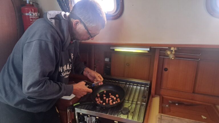 Als de zesde avond valt neemt Nicola mijn wacht over, en is het dus Jonas’ beurt om te koken. Zeezot stampt en ploetert naar het noordoosten over een steeds ruiger wordende zee, en om het onszelf makkelijker te maken overweeg ik de yankee te verwisselen voor de fok. Koken aan boord wordt steeds uitdagender, vooral nu we over stuurboord varen en de kombuis dus aan de hoge kant is. Groenten hebben de onstuitbare neiging op de vloer te belanden tijdens het snijden, pannen glijden ondanks het cardanisch fornuis koppig van het vuur af en de basale vaardigheid van iets ergens in schenken vereist een nauwkeurige berekening van de juiste hellingshoek. Tel daarbij op dat we zelf ook heen en weer gesmeten worden, en je snapt dat een avondmaaltijd bereiden heel wat acrobatische kookkunsten vereist.