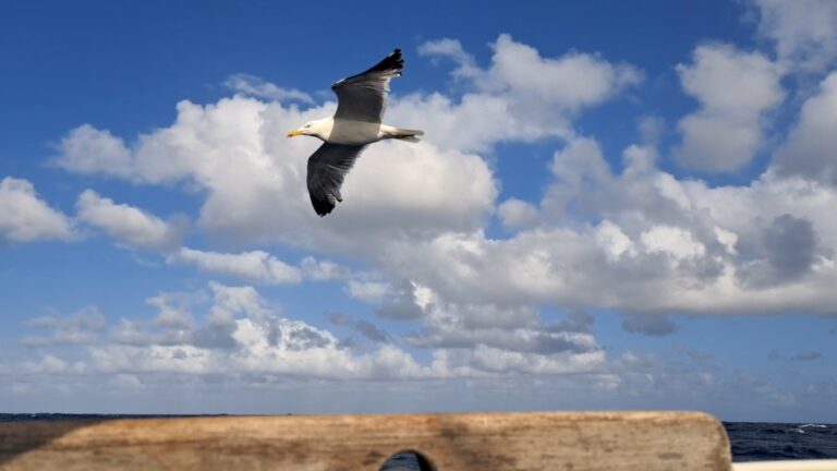Een zeemeeuw zweeft een eindje met ons mee, schijnbaar ongehinderd door de stevige tegenwind. De trim van zijn vleugels is volmaakt en verfijnd, zelfs Zeezot klappert meer dan hij. Met zijn vieren (Zeezot meegeteld) hopen we dat hij landt op de zeereling, maar na een aantal aarzelende pogingen durft hij het toch niet aan. We voeren hem een aantal crackers, omdat we niets beters bij de hand hebben. Je vraagt je af wat zo’n dier hier in zijn eentje doet, een heel eind uit de kust, tussen Madeira en de Azoren. Maar dat zal hij van ons evengoed wel denken.