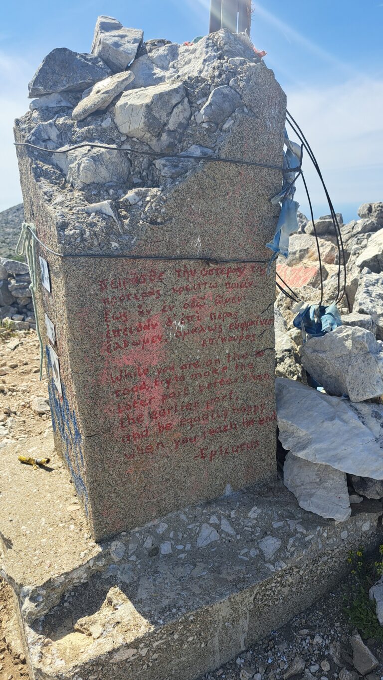 Het topboek is verzopen bij de laatste voorjaarsregens, en mijn pogingen er iets in te schrijven zijn tevergeefs. Gelukkig was ik voorbereid en heb ik mijn watervaste stift meegebracht. Op de sokkel van het topkruis is gelukkig nog plek voor een beetje Epicurus: “While you are on the road, try to make the later part beter than the earlier part, and be happy when you reach the end”.