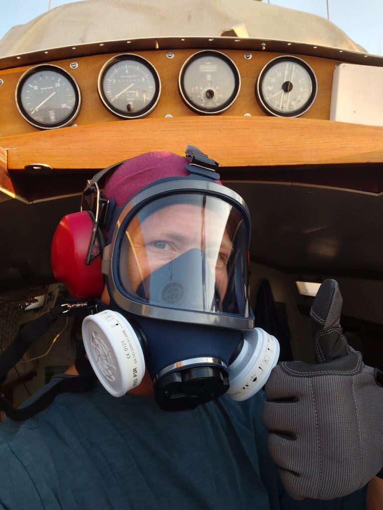 Zodoende sta ik zondagmorgen ingepakt in een volgelaatsmasker, capuchon, handschoenen en gehoorbescherming de oude rommel van mijn kiel te stralen. “Lady!”, hoor ik opeens iemand achter me brullen. “You cannot do that!”. Onmiddellijk voel ik de recalcitrantie in mezelf naar boven borrelen. Ik zet mijn machine uit, mijn koptelefoon af, mijn hakken alvast in het zand. Maar als ik fronsend omkijk lijkt de barse beveiliger gewoon een aardige Griek, die zonder te brullen nu eenmaal niet boven mijn kabaal uit kwam. Hij legt uit dat de rondvliegende stof- en staaldeeltjes ondanks mijn stofzuiger op de net gepolijste Swans en Hallberg-Rassy’s terechtkomen, en dat ik voor dit soort klussen daarom in de straalzone van de werf terecht kan. Ik kan hem geen ongelijk geven, dus gaan mijn hakken uit het zand en mijn machines weer aan boord.