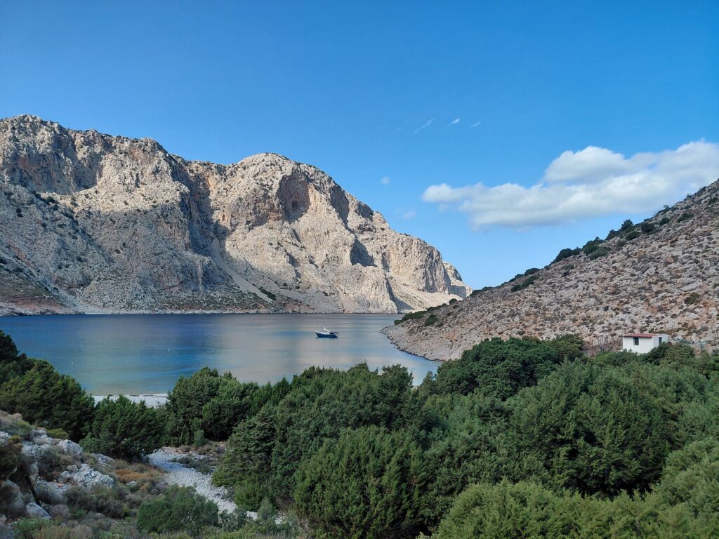Er staat voor morgen een straffe zuidenwind op het programma, dus zoek ik een kleine, beschutte baai uit aan de oostkant van Kalymnos. Ik ben er niet alleen, maar dat is eigenlijk wel fijn: als er met die sterke wind iets misgaat, zijn er tenminste hulptroepen nabij. Ik leg twee ankers uit en lijnen naar de kant, zodat ik ook nog veilig lig als de wind met extra sterkte door de kloof zou komen waaien.