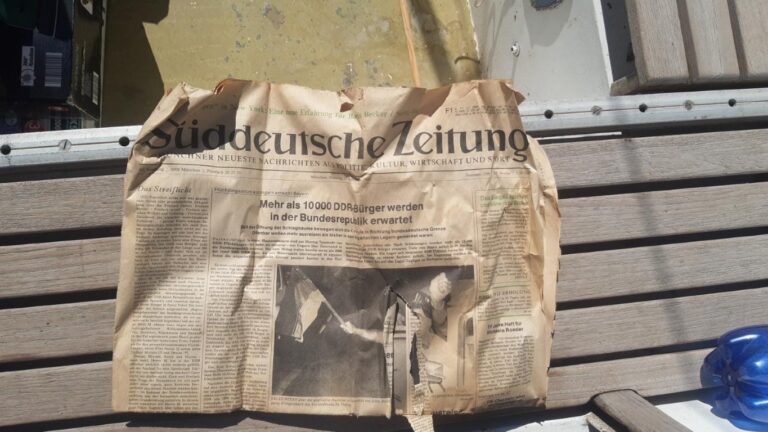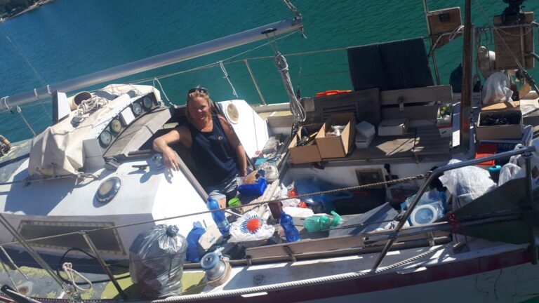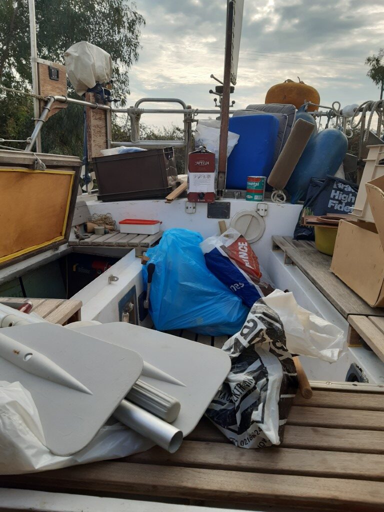 Stapels piepschuim, restjes hout, plaatjes RVS en een grote zak vol harpjes en blokken. Twee spuuglelijke tafelkleedjes, een Plath-sextant, een krant van vlak voordat de Berlijnse muur viel en twee klassieke, kanariegele zeilpakken die me helaas allebei niet passen. Het kost me twee volle dagen, maar dan is er tot mijn grote opluchting een heleboel zooi van boord, en is er aan boord eindelijk íets van ruimte en orde ontstaan.