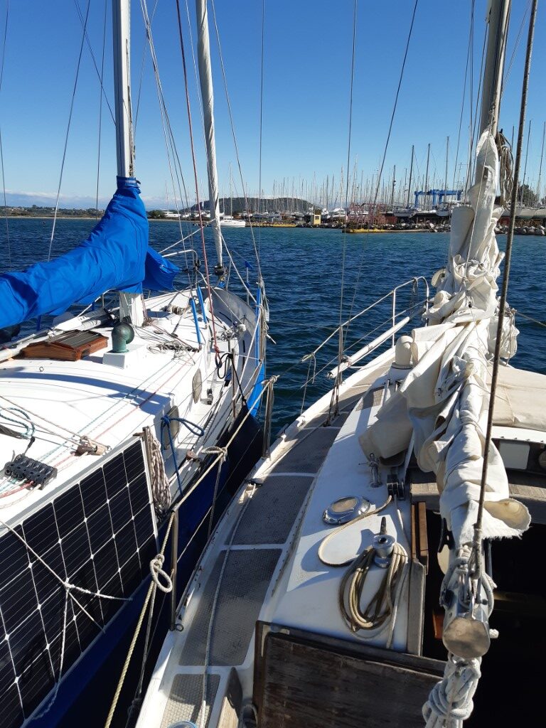 Twee van de drie dagen loop ik wat verloren rond, pulkend aan de roestplekken en neuzend in de scheepslading onderdelen die allemaal individueel in plastic zakjes zijn opgeborgen. Pas op dag drie kom ik eraan toe te doen waarvoor ik hier ben: ik smeer een bedenkelijke roestplek in de romp dicht met epoxyplamuur, sluit de nieuwe accu’s aan waar ze horen, vul de watertank, test de afsluiters, inspecteer het roer en roerlager, sla de zeilen aan en loop de lijnen na. Jelle brengt de verstaging op spanning en drukt me zijn satellietnoodbaken in handen: voor het geval het morgen helemaal misgaat