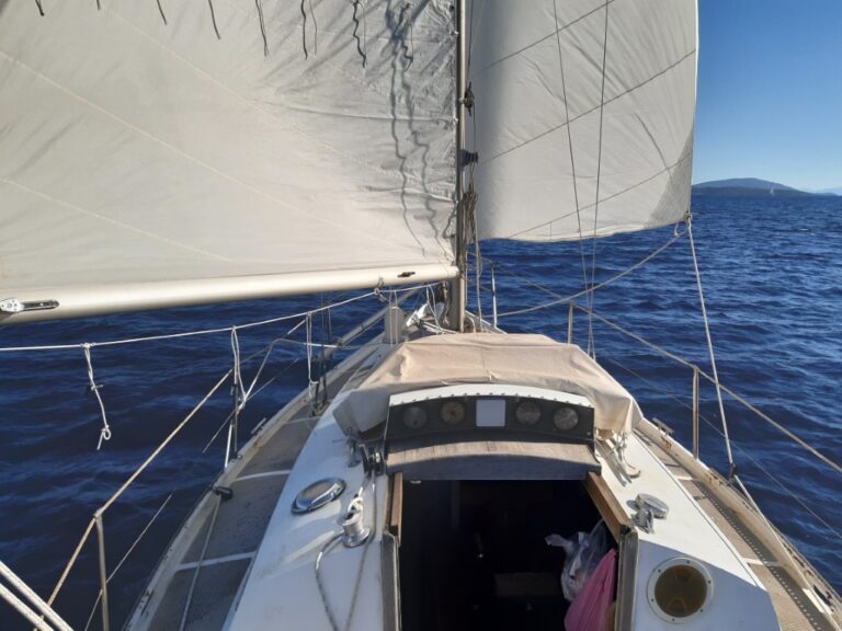 Als Jelle even later mijn boot afduwt heb ik nog net het laatste staartje van de ebstroom mee. Ik installeer eerst maar eens de elektrische autopilot, zodat ik mijn handen vrij heb om de zeilen te hijsen. Ik loop naar de mast en trek met verbazingwekkend gemak het grootzeil en de fok (met leuvers!) omhoog. Even waan ik me in mijn puberteit, zeilend op een valkje op het Paterswoldse meer. Alles aan boord is klein, licht en makkelijk hanteerbaar en de zee is zo vlak als een binnenwater. Onder me voel ik de boot onmiddellijk reageren op het opbollende zeil. Snel ga ik terug naar de kuip en leg haar op koers, tussen de betonning van het kanaal van Preveza door. De motor kan uit: we zeilen!