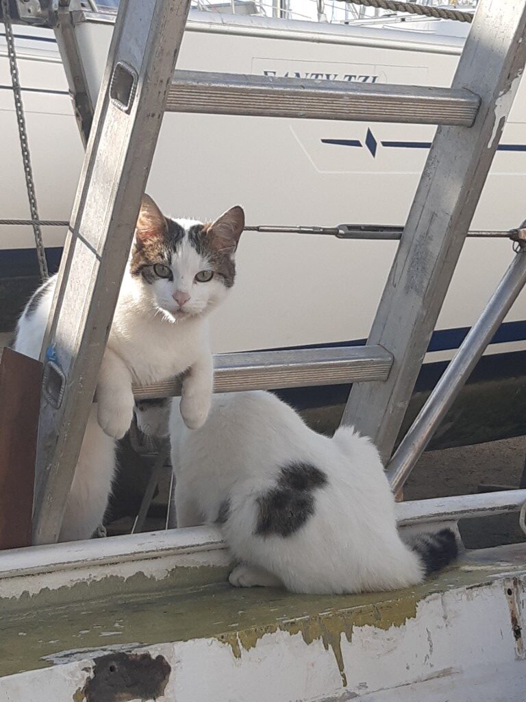 ‘s Avonds krijg ik een appje van de vorige eigenaren van de boot. Zij stonden met hun camper in de buurt van Preveza en hadden zicht op mijn afvaart. Op de foto’s die ze meesturen zie je Ataraxía met volle zeilen door het kanaal van Preveza zeilen. En als je goed inzoomt zie je mij, in mijn onderbroek… Zo zie je maar weer, je bent nooit echt alleen.