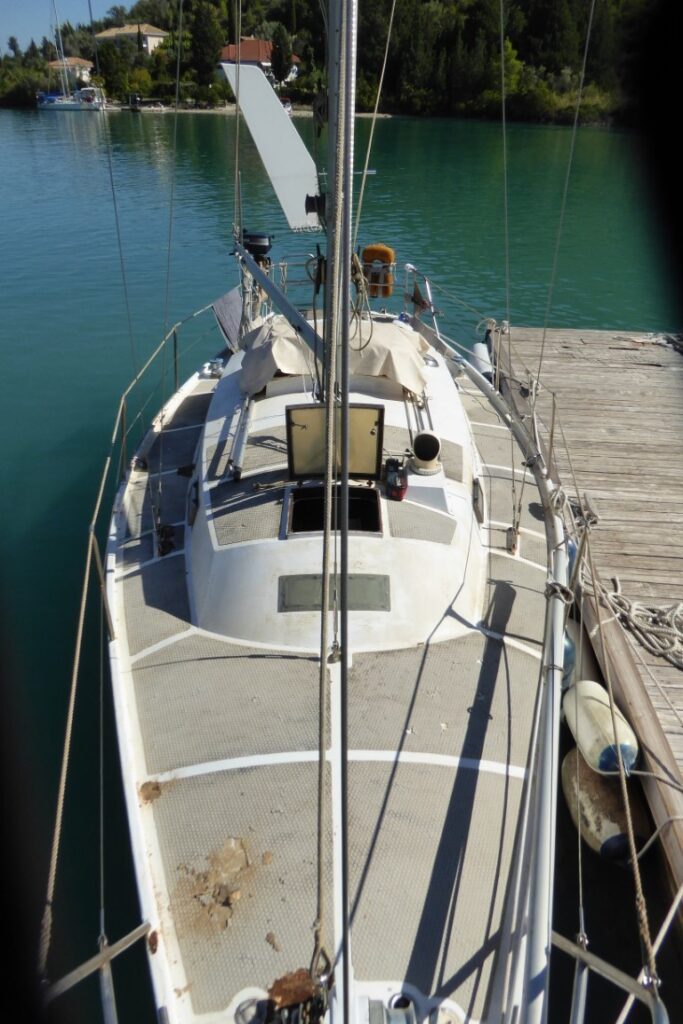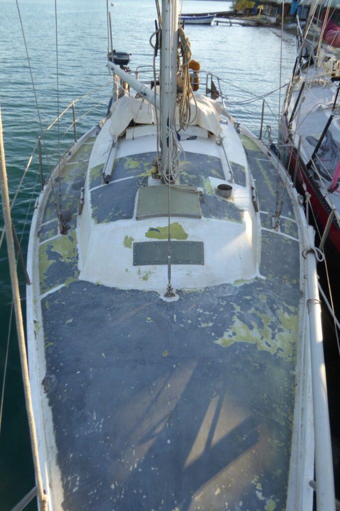 Mijn handen jeuken om te beginnen en zodra mijn lijnen in Nidri vastliggen stort ik me op de verweerde laag Treadmaster op het dek. Het zijn een soort linoneummatten met antislip die op het dek gelijmd zijn en ze zijn me een doorn in het oog. Ze zijn van zichzelf al oerlelijk, maar door de jarenlange Griekse zon zijn ze gescheurd en gebarsten en het is me inmiddels duidelijk dat er op meerdere plekken roest onder zit. Geen wonder ook: onder zo’n linoleummat kan water zich makkelijk ophouden en een roestpuist veroorzaken die pas openbarst als die zo groot is als een golfbal. Met een scherpe beitel hak ik ze los. Daaronder komt de verflaag uit de jaren ’70 bloot te liggen. De kleur doet me onwillekeurig denken aan de permanent geïnfecteerde snottebel van een jongen uit mijn basisschoolklas. Niet bepaald een gekoesterde herinnering, dus weg ermee! Onder de groene laag komt vrijwel overal prachtig glad gegalvaniseerd staal tevoorschijn, dat eruitziet alsof het gisteren van de wals is komen rollen.