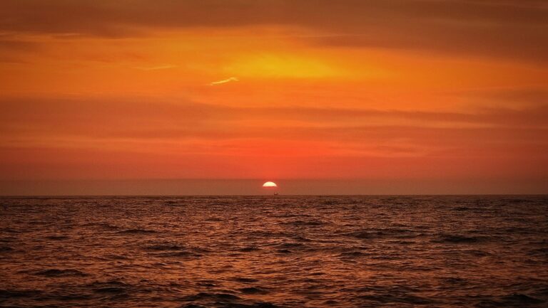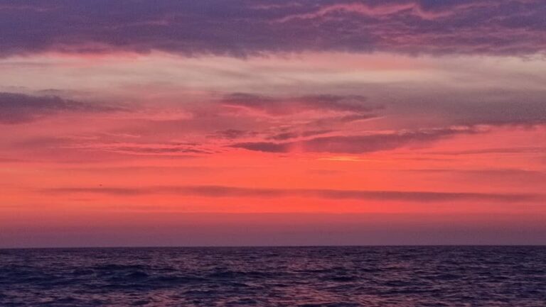 Van nachtzeilen is goed en wel geen sprake meer: als ik om half drie ’s nachts de wacht van Belinda overneem, is de lucht vaalblauw en de horizon roze. De zon lijkt niet goed te weten of ze onder moet gaan of juist op moet komen, en hangt nét onder de horizon als een toneelspeelster die in de coulissen snel van kostuum wisselt en weer opkomt.