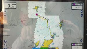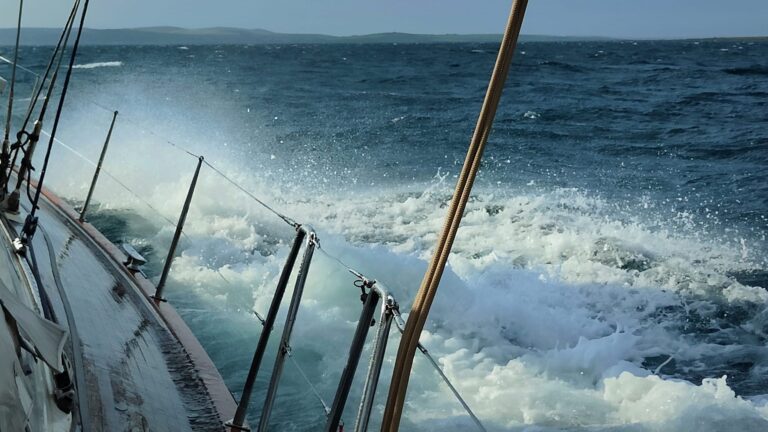 De volgende ochtend vertrekken we dus uit de haven, met de wind pal tegen, maar de stroming mee. Onder het eiland staat een flinke tidal race, en als ik op mijn eigen boot zou varen zou ik rechtsomkeert maken de haven in: mijn 28-voeter zou zich geen weg kunnen banen door dit watergeweld. Steile golfkoppen lijken nijdig hun tanden te willen zetten in elke scheepsromp die ze tegenkomen. Maar Cherokee is 50 voet en uitgerust voor ieder weerstype, en schipper Jouke twijfelt geen moment. Opkruisend tegen de westenwind banen we ons al schuimend en bruisend een weg naar het westen. Als ik om me heen kijk zie ik vijf breed grijnzende gezichten, en twee groene.