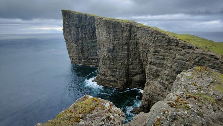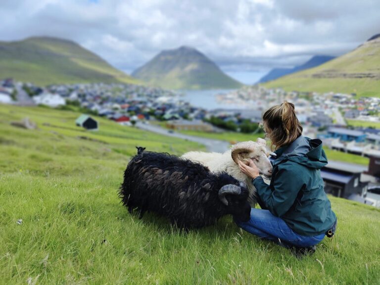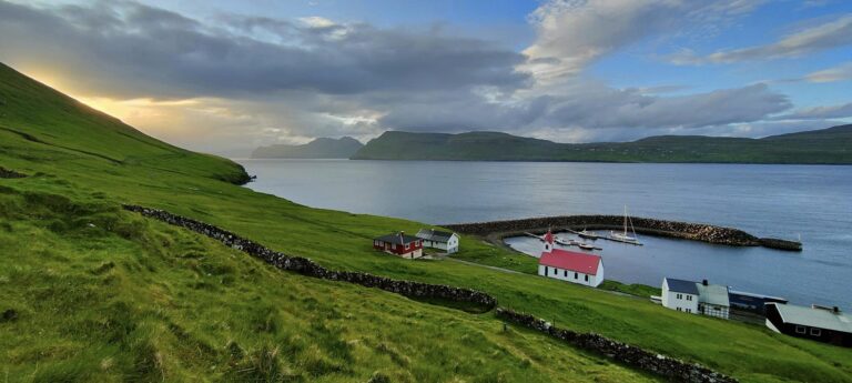 We leggen aan in de haven van Vágur, op Suᵭuroy. ‘Zuidereiland’, of ‘Zuideroog’, zoals ook veel waddeneilanden eindigen in ‘-oog’. In Vágur rusten we uit van de overtocht, en we maken een lange wandeling naar de steile kliffen aan de westkust. Hier strekt de oceaan zich naar het westen uit tot aan Groenland. Van bovenaf hebben we prachtig zicht op de vogels die hier in de rotsen nestelen. Jagers, stormvogels, zeemeeuwen en papegaaiduikers verdringen zich om een plekje in de rots. Iets verder landinwaarts struikelen we opeens over de weidevogels: wulpen, kluten, scholeksters en andere steltlopers waarvan ik de naam niet weet. En waar je ook loopt, overal staan dikbewolde schapen rustig te grazen, zoals ze dat al doen sinds niemand-weet-precies-wanneer.