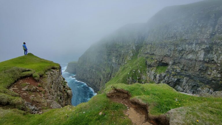Als we aankomen is het vroeg in de ochtend, al kan het ook laat in de avond zijn, of midden op welke dag dan ook. De zon houdt zich schuil achter een zilveren sluier van waterdamp, waardoor ook mijn laatste beetje tijdsbesef verdampt. Een tergend zacht briesje duwt ons langzaam in de juiste richting. Langzaam genoeg om de diesel erbij aan te zetten, maar ik durf de stilte niet te verbreken. Wel zwengelt Belinda de radar aan: het is onmogelijk te zeggen hoe ver we kunnen kijken, maar dat het te weinig is om veilig te navigeren is wel duidelijk. De eilanden kun je achter de ondoordringbare mistbanken alleen vermoeden doordat je al vanuit de verte de schapen zachtjes kunt horen blaten. Ook het gras dat ze eten schijn je te kunnen ruiken, als je tenminste een betere reukzin hebt dan ik.