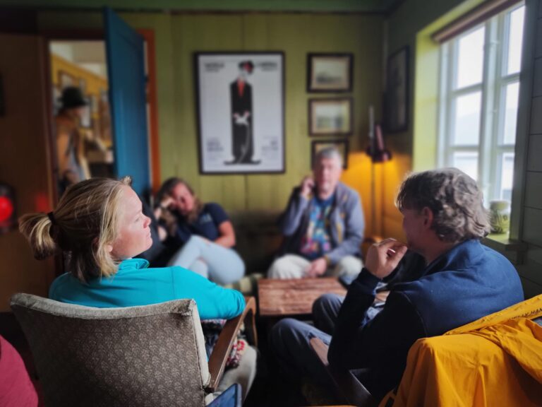 Zoals aangekondigd trekt er inderdaad een occlusiefront over. Regen, wind en een temperatuur waarbij je het liefst met een boek bij de kachel kruipt. Maar omdat het met z’n achten bij de scheepskachel toch ook snel benauwd wordt, huren we een auto om meer van het eiland te zien. Het landschap lijkt z’n schouders op te halen om het donkergrijze weer en de regen die in zichtbare vlagen over de vlaktes golft. Als je een eiland bent waar de oceaan al zó lang onophoudelijk tegenaan beukt kan een beetje water van boven je niet deren. Wij daarentegen zijn, nadat we een half uur aan de westkust naar het beuken van diezelfde oceaan in de diepte hebben staan kijken, doorweekt en rillerig. Gelukkig is er café Mormor (‘oma’), waar we met z’n achten alsnog met een boek en kom hete soep bij de kachel kruipen. Ten slotte is geen mens een eiland.