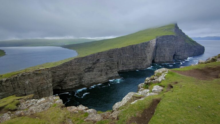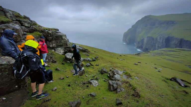 We wandelen onder meer langs het langgerekte meer Leitisvatn, dat uitmondt in de Bøsdalafossur-waterval. Vanaf de klif klatert het zoete water tientallen meters naar beneden, het zoute water in. Dit is ook de plek waar de Vikingen naar verluidt hun ongehoorzame en afgedankte slaven naar beneden duwden. Gelukkig worden díe wrede praktijken niet langer in ere gehouden.