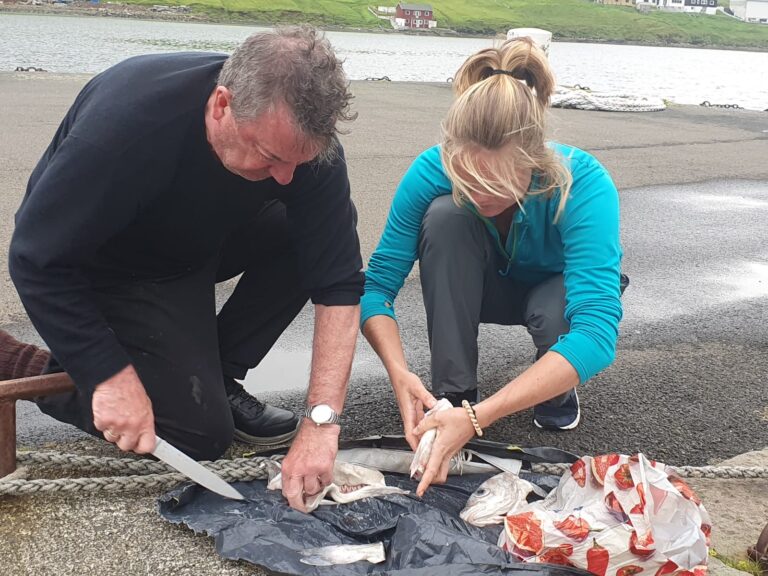 Als we terugkomen van de wandeling is er naast ons in de haven een prachtig oud zeilschip komen liggen. De Johanna, gebouwd in 1884, werd tot 1972 gebruikt als vissersschip. Daarna lag ze ongebruikt in de haven, tot ze in 1980 voor één kroon van de ondergang gered werd door de plaatselijke roeivereniging. Dat verhaal spreekt me natuurlijk wel aan, dus ik ga langs om een praatje te maken. De vereniging komt net terug van een visweekend, en voor ik het weet sta ik boven een enorme bak met dode vis het avondmaal uit te zoeken voor vanavond. Het worden drie kabeljauwen, die me vanuit de plastic zak meewarig blijven aankijken. Ik krijg op de kade hulp bij het schoonmaken. ‘Een half uurtje in de oven met zout, peper en citroen’, vertrouwt de visser me toe. Het wordt de best gelukte maaltijd van de maand.
