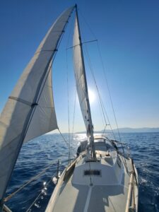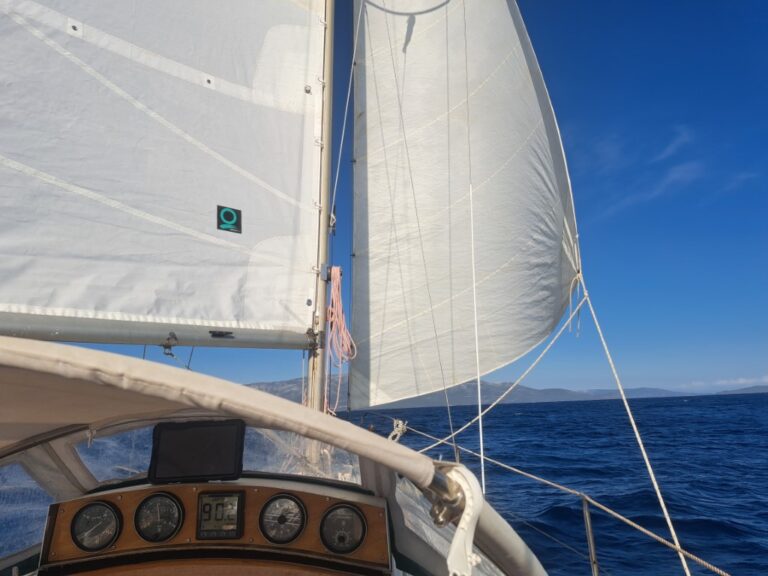 Ik haal de schoten aan en Trixie gaat er vandoor als een vaars die na een lange winter eindelijk naar buiten mag. De wind trekt verder aan, grote witte schuimkoppen stormen op ons af en ik stuur op de hand, om de autopilot te sparen en de kracht van wind, zee en boot zelf te voelen. Waarom heb ik voor mijn nieuwe zeil niet gekozen voor een derde rif?