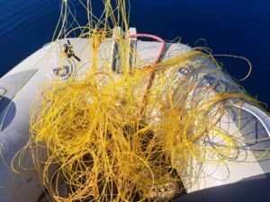 Het is rustig voorjaarsweer en de Maestro uit het noordwesten, die vooral in de zomer overheerst, slaapt meestal uit tot een uur of één. Steenkoud is het water nog, maar de onderwaterwereld is hier te mooi om niet van dichtbij te bekijken. Niet voor niets is dit eilandje een natuurgebied. Ik pak mijn snorkelspullen en ga op zoek naar onderwaterleven. In het bijzonder speur ik naar schriftbaarsjes, want die houden zich vaak op bij het hol van een octopus, uit op de restjes van de octopusmaaltijd. Ze zijn dus een uitstekende verklikker om deze meesters in camouflage te vinden. Helaas vind ik baars noch octopus, maar wel een kluwen visdraad, gewikkeld om een onderwaterrots. Een halfuur later zit ik met een muts en een kop thee en een bijboot vol visdraad op te warmen in de zon. Toch ook geen slechte score.