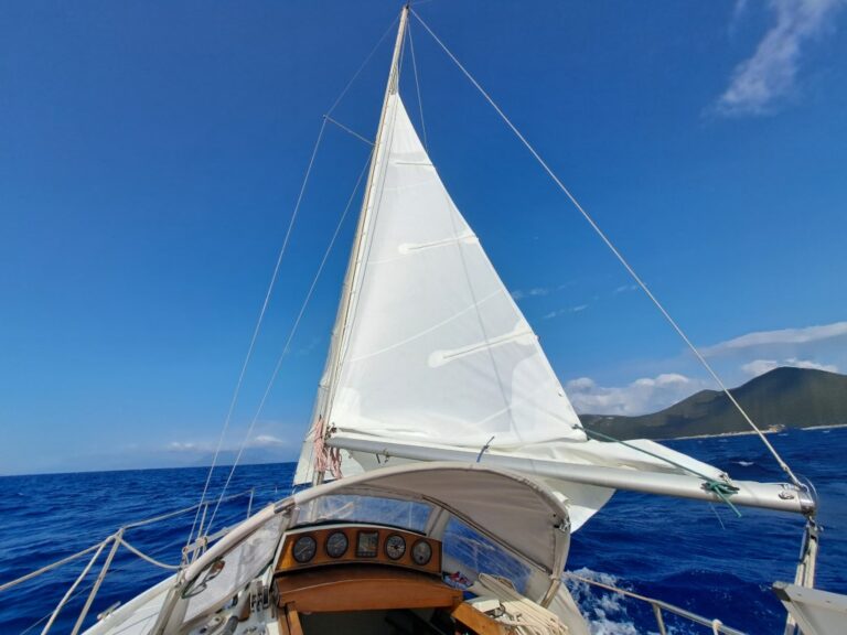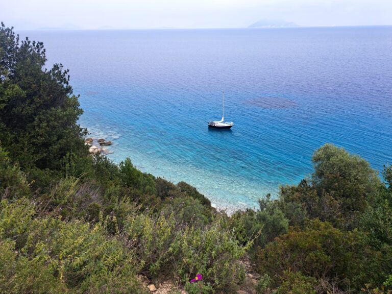 Vanuit Kastos zet ik koers terug naar Nidri. Een ruimhartige wind blaast ons de goede kant op en deze keer sta ik luidkeels te zingen van geluk. De zon schijnt, ik lig languit in mijn ondergoed op het voordek te kijken naar hoe mijn bootje door de wereld vaart. We draaien langs Mytika aan het vasteland, de hoek om richting Meganisi. Een verdacht uitziend wolkje komt mijn kant op, in de verte zie ik Nidri onder een grote regenbui verdwijnen. Ik knik bedachtzaam: toch maar even reven.