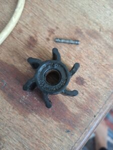 De volgende ochtend is de motor afgekoeld en loop ik het systeem na. Ik spoel de waterleidingen door en inspecteer de impeller op afgebroken bladen. Op het eerste gezicht is er niks stuk, maar toch komt er na het starten geen water uit de uitlaat. Ik duik in mijn voorraden een vervangende impeller op en pas als ik de oude eruit heb zie ik het: het rubber is van de aandrijfas losgeraakt. Geen wonder dat die niks meer doet. Met de nieuwe impeller én de koelslang op z’n plek is het probleem voorlopig verholpen.