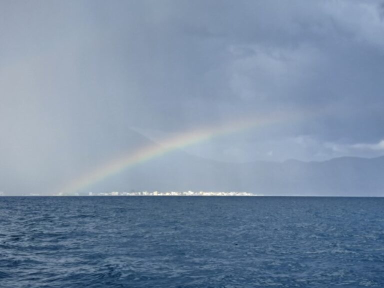 Als het rif op z’n plek zit (netjes deze keer) heb ik nog nét twee tellen om m’n jas te grijpen voordat de stortbui losbarst. Ik moet eruitzien als een volslagen idioot: in onderbroek en regenjas, schaterlachend om het water dat in een zilveren waas op het dek neerklettert en de perfecte regenboog die er boven Mytika verschijnt. Als de bui voorbij is worden we beloond met ideale wind om terug naar Nidri te varen. Toch maar even een pitstop voor een nieuwe impeller, brandstofleiding en GPS-antenne…. Maar die gordijntjes komen later wel!