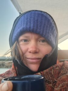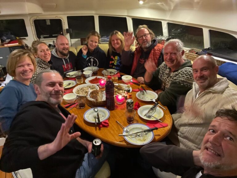 Het is misschien maar goed dat het intussen écht winter is geworden en het bijna onophoudelijk regent. Al zou mijn boot nu ‘af’ zijn, dan nog had ik niet willen uitvaren. Een buitje kan geen kwaad, maar dit zijn muren van water waar mijn boot als onderzeeër dienst zou doen. Gelukkig ligt mijn baai vol met lotgenoten, die allemaal van de nood een deugd maken en het regenachtige weer gebruiken om elektra te herzien, gordijntjes te naaien en op droge dagen vooral veel raampartijen opnieuw te kitten. Regelmatig komen we samen, als het weer het toelaat tijdens de wekelijkse barbecue, en anders aan boord bij iemand met een tikkie meer ruimte dan ik. We delen grote pannen soep, de beste muziek, flessen wijn en sterke verhalen, en helpen elkaar waar nodig een handje met het bootwerk.