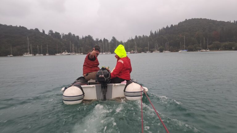 Alsof de wereld (‘het Al’) ermee instemt is het plots het meest stralende winterweer dat we hier in de Ionische Zee in tijden zagen. Bij wijze van testvaart zet ik koers naar Mytika, een mijl of twaalf oostwaarts en normaal gesproken een paar uur varen. De wind staat goed en bolt mijn zeilen terwijl de windvaansturing -zij het ietwat aarzelend- haar werk doet. Toch blijft de snelheid koppig steken op drieënhalve knoop, terwijl ik voorheen bij goede wind toch echt de vijf wel haalde. Als ik de ankerplaats op motor lijkt ook het toerental begrensd te zijn. Het is geen raadsel waar dat aan ligt: na al die maanden in een ondiepe baai hangt er een ware botanische tuin aan het onderwaterschip van Trixie.