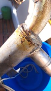 De enige monteur op Lefkas die dit op kan lossen, heeft een motorongeluk gehad en kan zijn schouder niet gebruiken. Dus gaat de pomp met mijn vriend Marco mee naar Italië, om hem daar te laten repareren. Als noodoplossing zet ik een elektrische impellerpomp naast de motor, met een schakelaar op het motorpaneel. Zo heb ik een koelwaterpomp op reserve. En nu ik dan toch in het motorruim aan het werk ben, besluit ik om het waterslot van mijn uitlaat te vervangen. Dat is door de jaren heen gaan roesten en spuwt hoe langer hoe meer roestig water het ruim in. Het nieuwe onderdeel is snel geleverd, en ik vervang ook meteen de uitlaatslang. Maar terwijl ik het zooitje zit te monteren, breekt het rubber van de uitlaat-doorvoer af. Dát onderdeel blijkt helaas níet leverbaar, en omdat het bijna kerst is wordt het wachten tot Januari…
