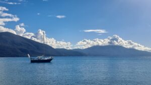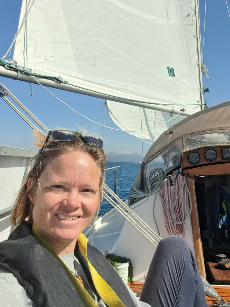 In één van die café’s zit ik ’s morgens met een kop koffie uit te kijken over zee: op de voorgrond mijn bootje, in de verte de rook van Nidri, waar ik de afgelopen drie jaar van een onervaren zeiler veranderde in een onervaren klusser. Onervaren, want terwijl ik heel veel leerde, leerde ik vooral ook hoeveel er nog te leren valt. Maar hoewel ik als ik naar Trixie kijk nog steeds veel imperfecties zie, overheerst toch het enorme plezier dat ik heb als ik haar zo dapper aan haar anker in het blauwe water zie liggen, klaar voor een nieuw avontuur. Ik weet haast zeker dat ik nog wel eens een andere boot vind om op te knappen, maar dat is voor later: nu lonkt de zee, en kan ik niet wachten om met Trixie eindelijk een lang eind te gaan varen.