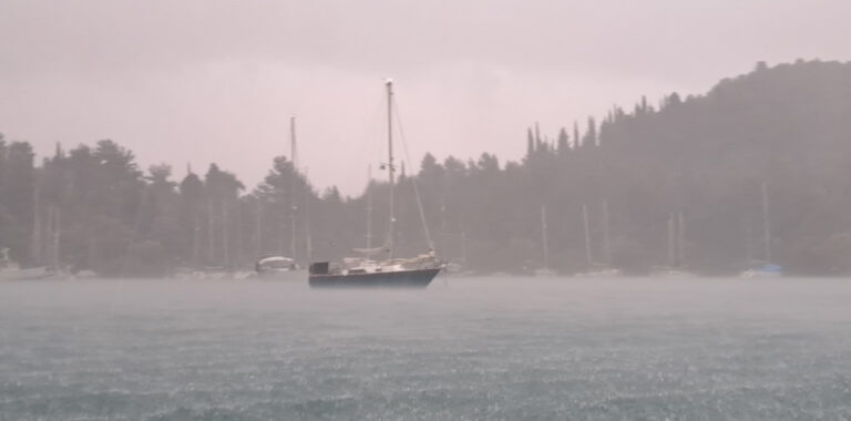 Als ik op een vroege morgen na zo’n avond met één ouzo te veel achter de kiezen en een zich aankondigende migraine in mijn bed lig terwijl de hagelbuien overtrekken, vertelt mijn richtingsgevoel me opeens dat er iets niet klopt. Als ik zo goed en zo kwaad als het gaat opsta een mijn kop uit het kajuitluik steek, zie ik dat ik opeens langszij aan de steiger lig. Dat hoort niet: ik lag aan een mooringlijn met de boeg naar voren. Blijkbaar is het mooringblok aan de wandel gegaan. Ik ben meteen wakker en nuchter en sleur met alle kracht die ik kan opbrengen mijn boot weer op zijn plek aan de boot die naast me ligt, terwijl de hagel me om de oren slaat.Toch fijn, zo’n manoeuvreerbaar bootje…