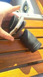 Omdat het weer niet meezit, duurt het langer dan gepland, maar het komt uiteindelijk af. Als ik naar de steiger vaar om alles daar te installeren, valt me echter op dat de koelwaterpomp van mijn motor voor de tiende keer is gaan lekken, deze keer langs de as. Ik kan het ding inmiddels met mijn ogen dicht demonteren en stel al snel vast dat er slijtage is ontstaan waar de as in het pomphuis loopt.