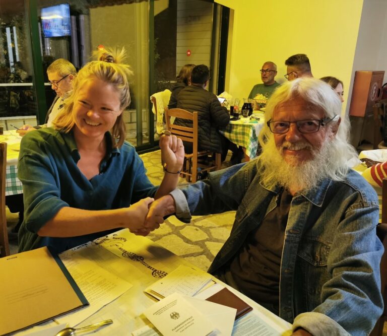 Zodoende rij ik op een zonnige donderdag met mijn bevriende havenbuurman Marco naar Ionion marine, gewapend met een hamer, een schroevendraaier en een fototoestel. Voor de boot staat een glimmende camper. Als we naast de camper parkeren komen daar een vriendelijk ogende man met lang, wit haar en een al even vriendelijke ogende vrouw met een heldere oogopslag uit tevoorschijn. Ze stellen zich voor als Manfred en Christiane en schouderophalend gebaren ze naar de boot: “dit is ‘r, ze is er helaas niet zo best aan toe.” Ze vertellen dat ze vanwege de Covidpandemie al jaren niet bij de boot geweest zijn. Dat heeft de nodige gevolgen: binnen hebben ze een wespennest aangetroffen en in het voordek zit een roestgat. Manfred schudt meewarig zijn hoofd: “verwacht er niet te veel van…”.
