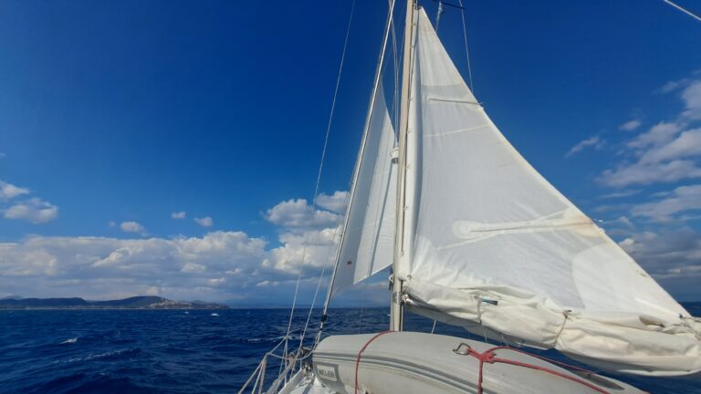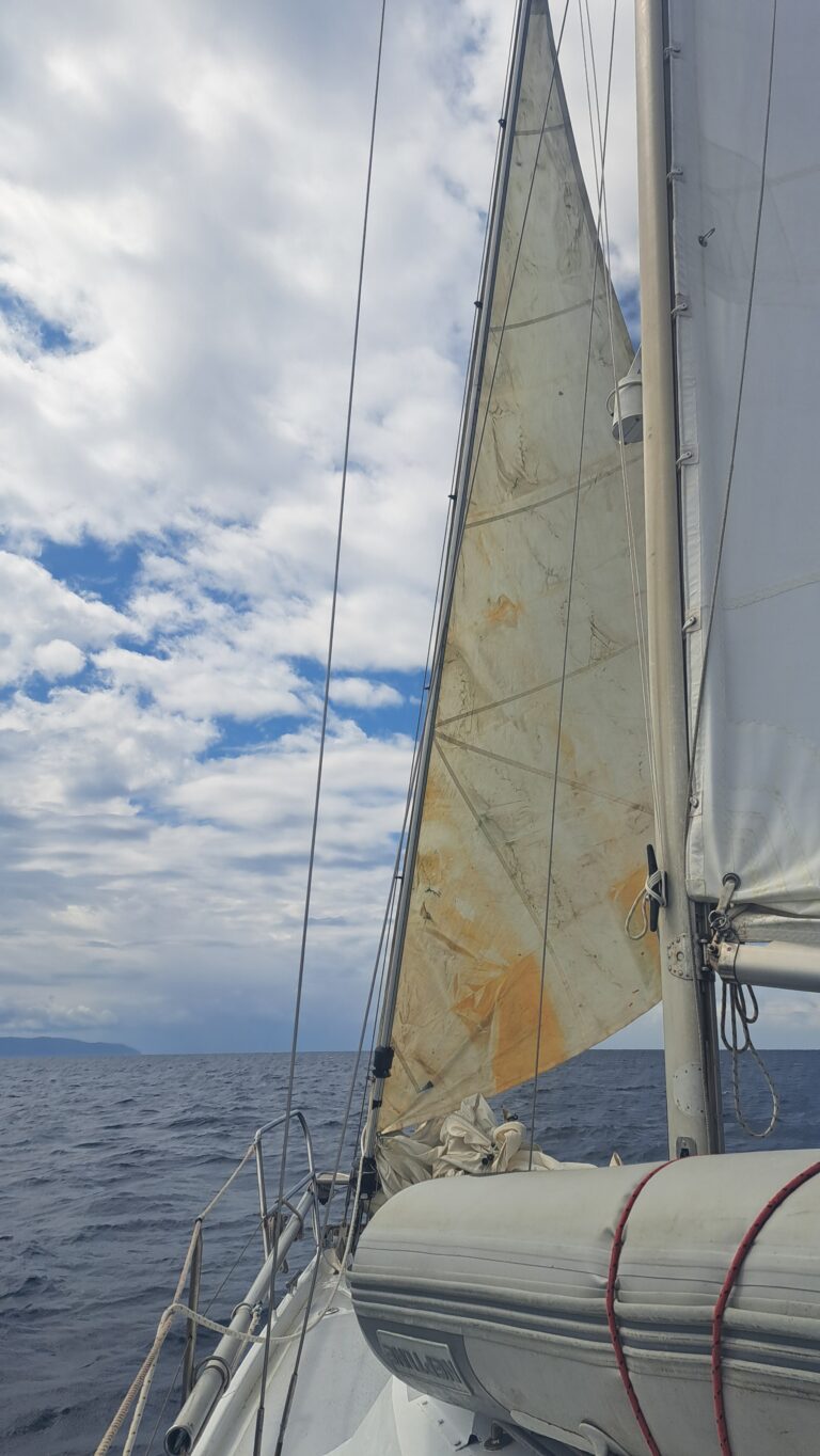 De vieze werkfok waar Trixie niets van moest hebben heb ik inmiddels wat aandacht gegeven, zodat de leuvers werken en de ergste roestvlekken verdwenen zijn. Bij nader inzien is het eigenlijk een prachtig sterk zeil, als je niet teveel op het uiterlijk afgaat. ‘Vieze Freddy’ noem ik ‘m, en hij laat zich goed combineren met een dubbel gereefd grootzeil. Uit het logboek: “Zuidoost 5, koers instabiel. Vieze Freddy gehesen. Dat helpt, want de wind neemt af.” We vliegen naar het zuiden om Elafonisos heen. Daarna stuur ik aan op de kaap, aan de wind en met korte golfjes die de voortgang beperken, maar we maken genoeg gang met windkracht 5 op de neus.