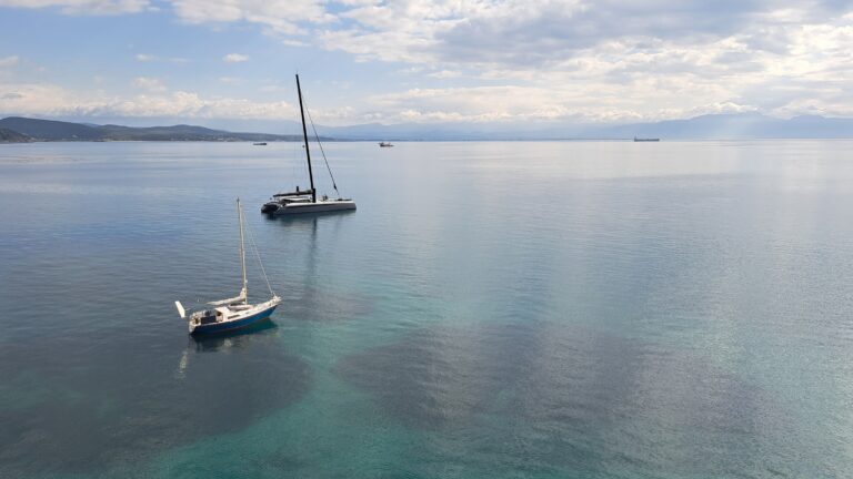 Tevreden zit ik even later in mijn zeiljas in de kuip, terwijl Vera probleemloos stuurt en we met 5 knopen halve wind naar Gytheion varen. Niet slecht voor een bikini van zeildoek! Zodra we bij Gytheion de hoek om draaien wordt de zee vlak en de wind poeslief. Klokslag 6 uur laat ik het anker zakken achter het eilandje Cranae, zout tot achter mijn oren maar ten diepste tevreden. Naast me ligt een peperdure carbon catamaran met crew, die ik een uur eerder onder vol zeil naar Gytheion heb zien sjezen. Niet veel later komt een tweede catamaran naast ons liggen: Waldemar, die vandaag vanuit Koroni is komen varen, precies dezelfde afwegingen heeft gemaakt als ik, en dus in dezelfde haven uitkomt.