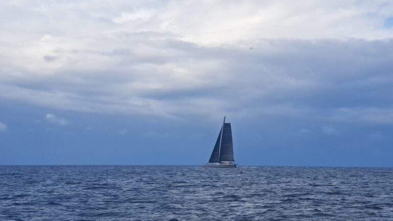 ik het voorzeil voor de fok. Met de korte, steile golven van de wind die er zonet nog was is dat op het voordek een wilde en natte rodeorit van een halfuur, maar het lukt uiteindelijk om Freddy terug in de zak te worstelen, de fok te hijsen en vol grootzeil te zetten. De bakbeesten die me aan weerskanten om de oren vliegen hou ik intussen in de gaten: eentje gaat bakboord van me langs, eentje stuurboord, dus als ik met mijn rodeostier blijf liggen waar ik lig is er niets aan de hand. “Rustig… rustig… kalm… kalm…” hoor ik mezelf herhalen, en ik vraag me af tegen wie ik het heb.