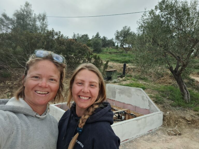 Jessica en Marijn zijn vrienden van mijn leeftijd, die ik ken van toen ik nog in Groningen woonde. Een paar maanden geleden hebben ze Nederland achter zich gelaten en zijn ze met hun hele hebben en houden in een camper naar Griekenland vertrokken, om hier in een oude olijfboomgaard hun eigen huis te bouwen. Ik lig praktisch in hun achtertuin, want hun land ligt hier een kwartiertje rijden hier vandaan en dat is natuurlijk geen toeval. Het is drie jaar geleden dat we elkaar voor het laatst zagen, toen zij nog in hun camper door Europa op verkenning waren en ik nog op ‘mijn’ vorige boot rondvoer, op verkenning voor een andere. Wat is er sindsdien een hoop veranderd!