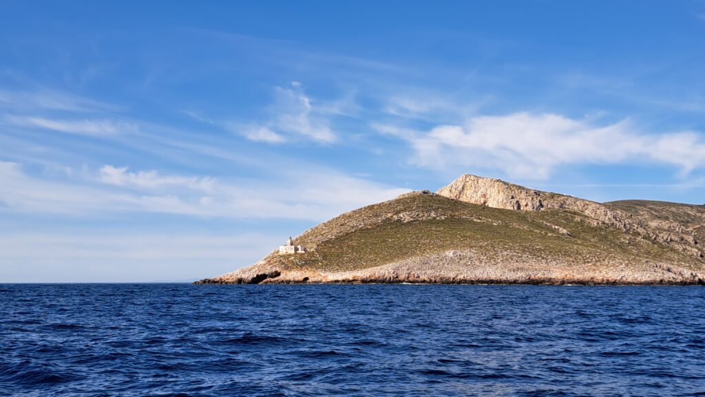 Als we Spetses voorbij zijn gaan we bakboord uit richting Hydra. De deining neemt af, dus kan ik de stormfok aanslaan met een dubbel gereefd grootzeil. Zo gaat het beter, en krijgen we meer rust in de boot. Dat geeft mij ook de kans om benedendeks wat uiltjes te knappen. Totdat de wind achter Hydra weer afneemt, en de snelheid te ver terugloopt. Gedaan dus met mijn rust: aan dek om opnieuw het zeil te wisselen. Om vier uur zijn we terug bij genua en vol grootzeil, maar de snelheid blijft teruglopen. Een uurtje later staat de motor te brommen.